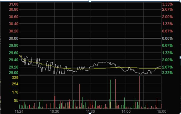 2011年11月23日臨近收盤期間(14:56:24至14:59:28),任某某為了在短期內(nèi)拉升股價(jià),大量申報(bào)買入“X”4筆共計(jì)63,000股,占尾市階段市場(chǎng)申買量的比例高達(dá)75.54%;委托價(jià)格由29.60元升至32.00元,每筆均高于當(dāng)時(shí)市場(chǎng)上的買1檔價(jià)格,三分鐘內(nèi)將股價(jià)由29.35元拉升至30元收盤,拉升幅度達(dá)2.21%。(見下圖)